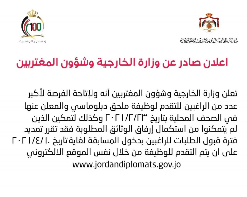 تعلن وزارة الخارجية وشؤون المغتربين أنه ولإتاحة الفرصة لأكبر عدد من الراغبين للتقدم لوظيفة ملحق دبلوماسي والمعلن عنها في الصحف المحلية بتاريخ 23/2/2021 وكذلك لتمكين الذين لم يتمنكوا من استكمال إرفاق الوثائق المطلوبة فقد تقرر تمديد فترة قبول الطلبات للراغبين بدخول المسابقة لغاية تاريخ 10/4/2021 على ان يتم التقدم للوظيفة من خلال نفس الموقع الالكتروني (https://jordandiplomats.gov.jo)